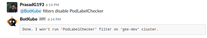 If you want to stop receiving notifications from BotKube, run @BotKube notifier stop from the configured channel where BotKube is added. You will no longer receive notifications from the BotKube