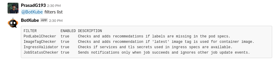 Run @BotKube filters enable {filter-name} to enable perticular filter to run checks on resource specs